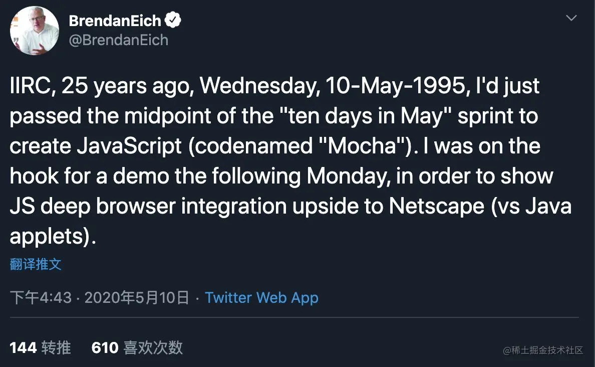 没记错的话,25 年前的今天,1995 年 5 月 10 日,星期三,我刚刚过了创造 JavaScript(代号为 “Mocha”)的“5 月的 10 天” 冲刺的一半。我正在写下个周一就要交付的一个演示,目的是展示 JS 与 Netscape 的深度浏览器集成(相对于 Java 小应用)。