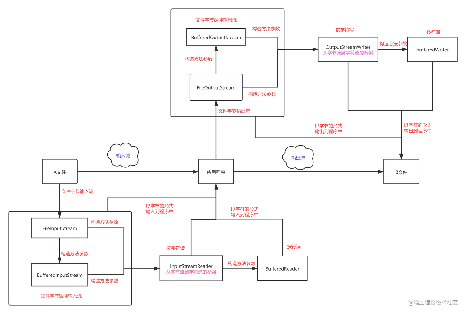 首先我们始终记住一点:我们的输入流、输出流是相对我们编写的应用程序来说的。