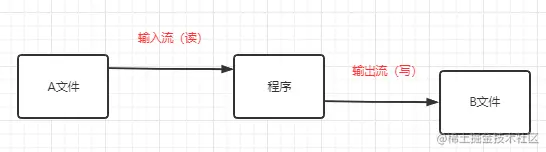 - 输出流就是从我们的应用程序到B文件的这段流(从应用程序输出到了B文件中,写,就是写入到B文件中)