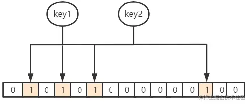 当 key1 和 key2 映射到位数组上的位置为 1 时,假设这时候来了个 key3,要查询是不是在里面,恰好 key3 对应位置也映射到了这之间,那么布隆过滤器会认为它是存在的,这时候就会产生误判(因为明明 key3 是不在的)。