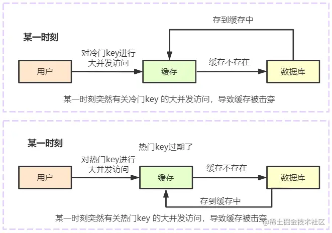 缓存击穿是指有某个key经常被查询,经常被用户特殊关怀,用户非常 love 它 (*^▽^*),也就类比“熟客” 或者 一个key经常不被访问。但是这时候,如果这个key在缓存的过期时间失效的时候或者这是个冷门key时,这时候突然有大量有关这个key的访问请求,这样会导致大并发请求直接穿透缓存,请求数据库,瞬间对数据库的访问压力增大。
