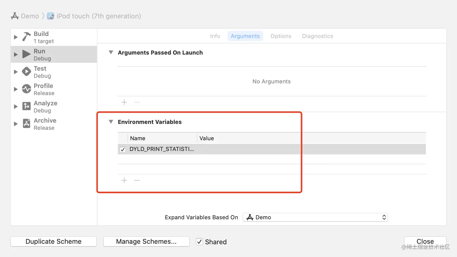 我们设置环境变量DYLD_PRINT_STATISTICS,运行工程,打印应用启动时的时间消耗情况: