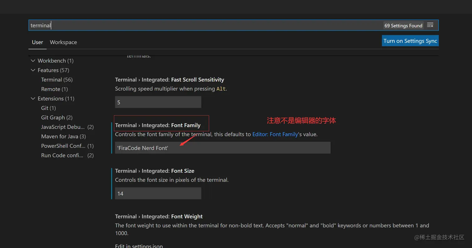 - 设置终端字体,字体不生效或者奇怪, 请重启vscode