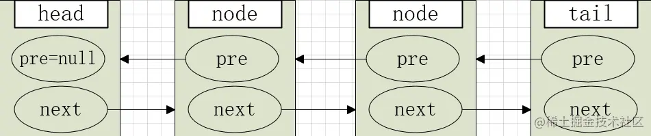 node.prev = pred;//把当前节点前任节点指向队尾节点