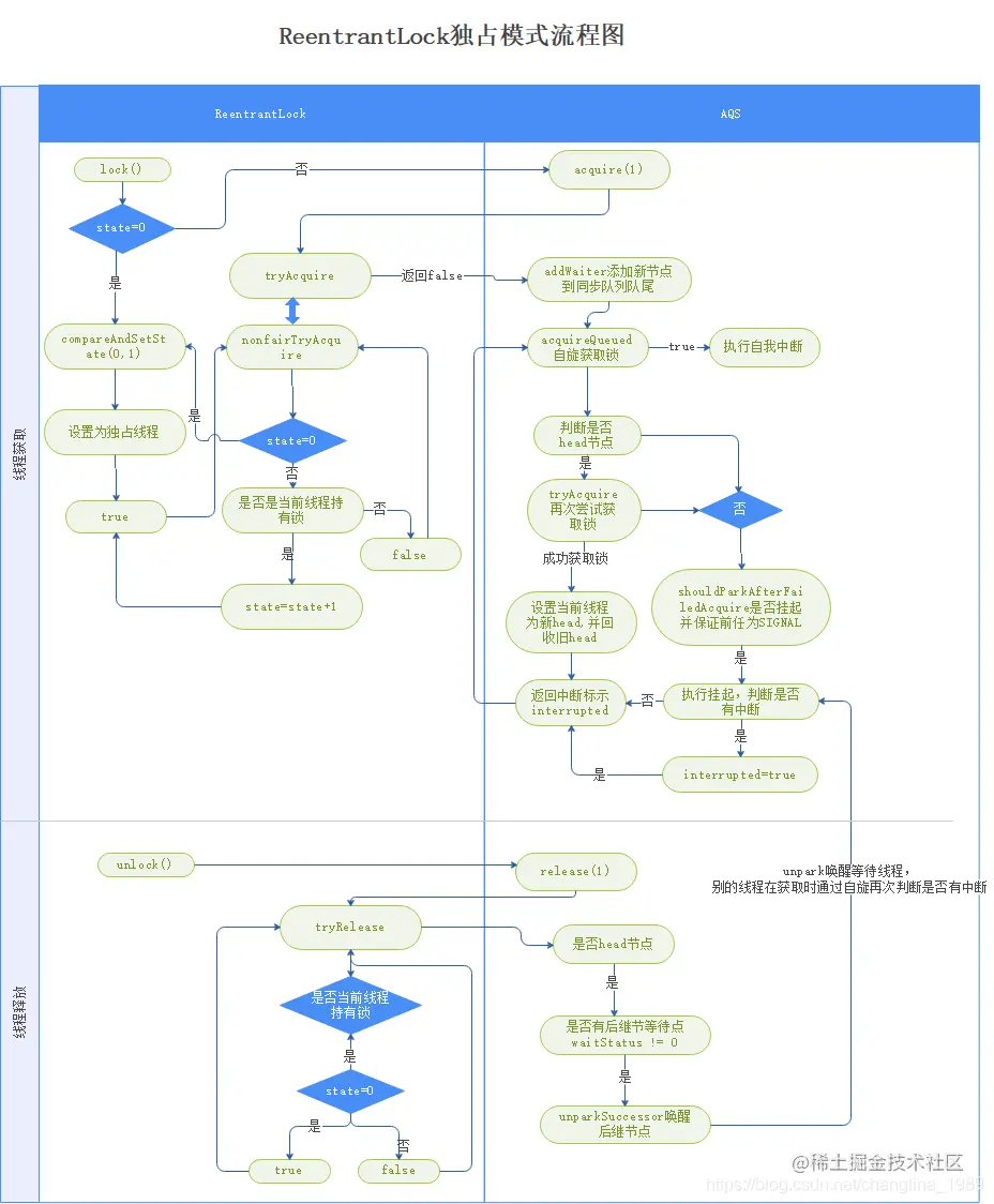 以上时整个独占模式下锁获取和释放的流程图,供自己参考。