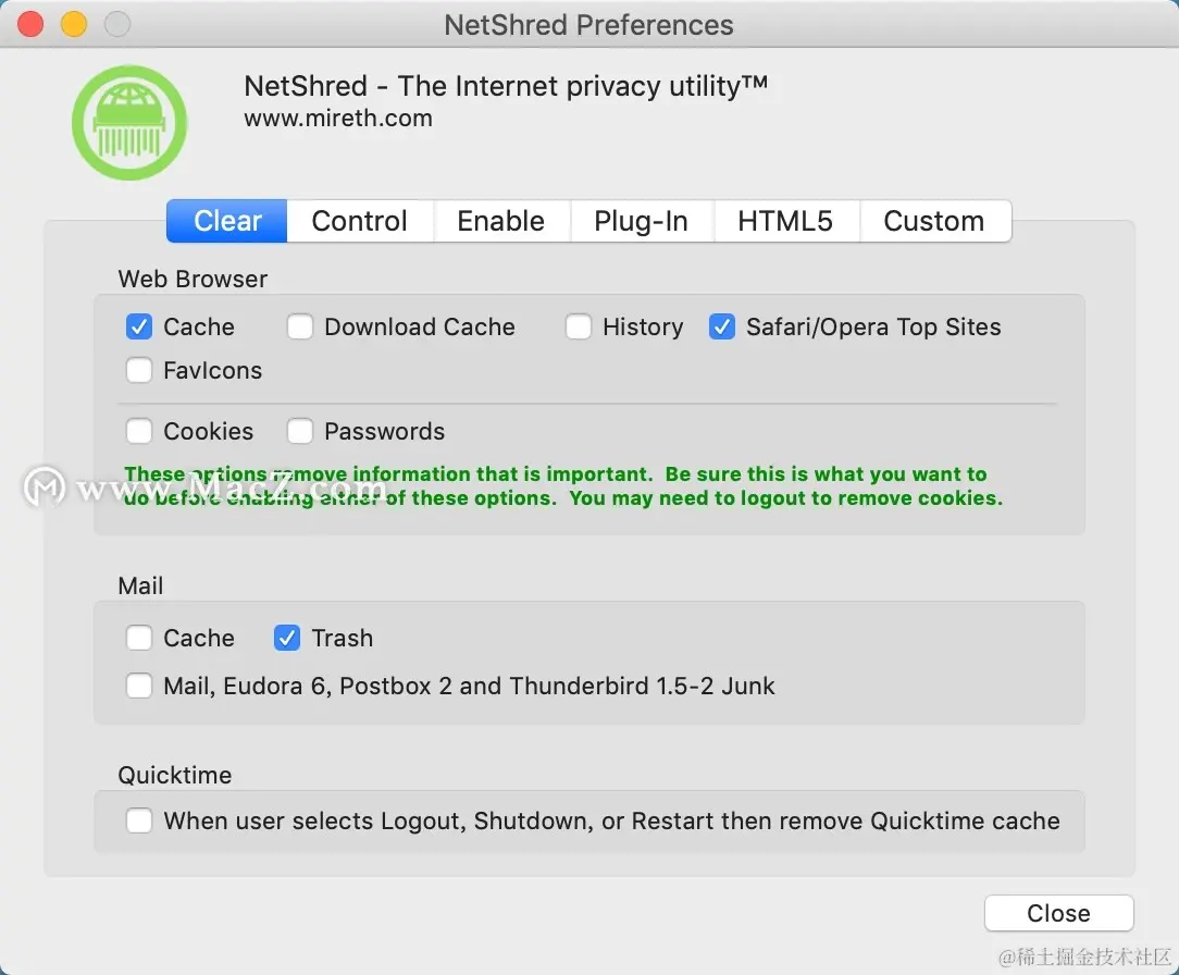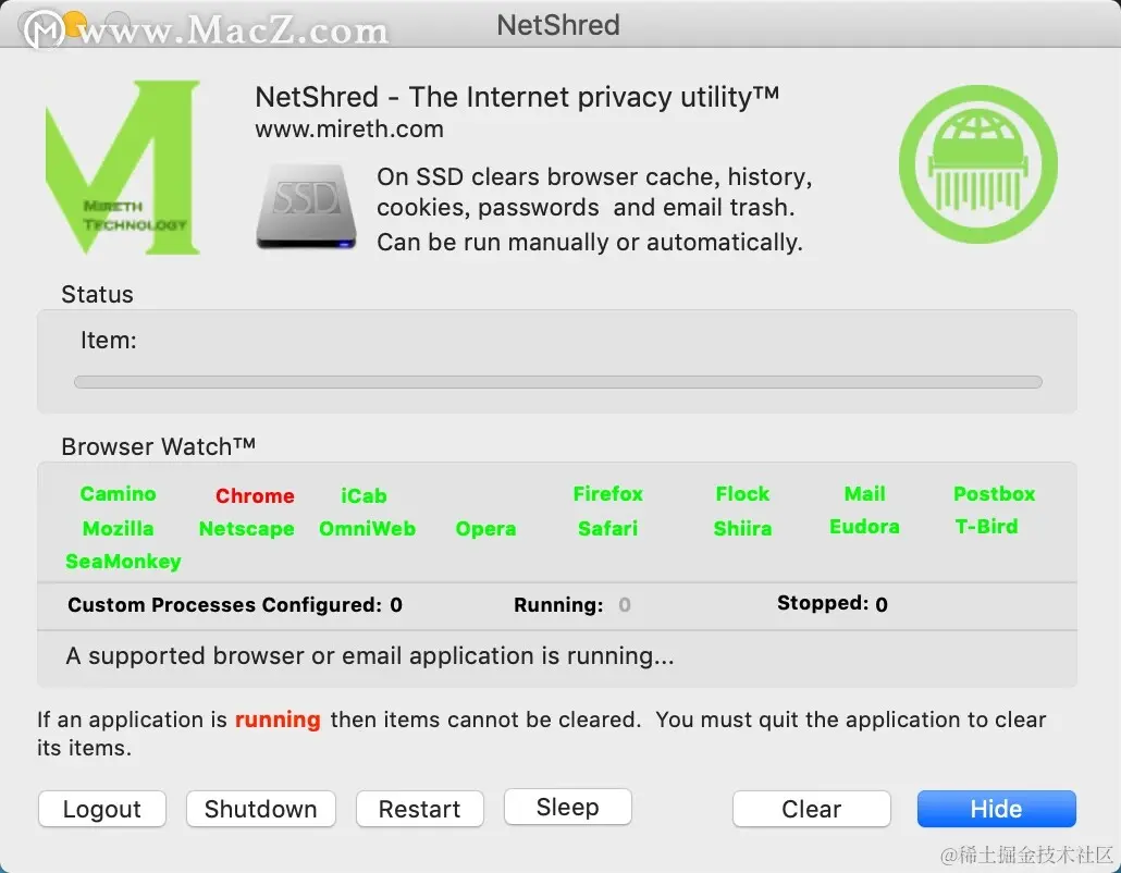 使用NetShred X自动清除缓存和历史记录,这是一款易于使用的Mac OS X互联网清理器,用于清除浏览器和电子邮件应用程序的浏览数据。在HD上,它删除了Mac OS X上几乎所有浏览器和电子邮件程序的所有浏览数据,而不仅仅是删除。在SSD上,信息被清除。
