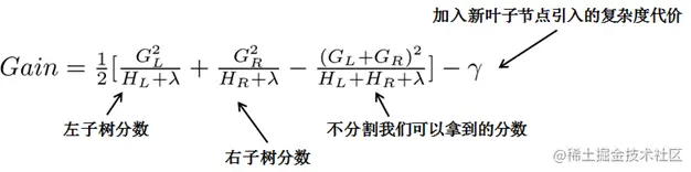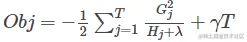 目标函数obj中的各部分,表示着每一个叶子节点对当前模型损失的贡献程度。融合一下,得到Gain的计算表达式,如下所示: