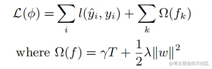 - 损失函数的加入了正则项Ω 正则项对节点数目及叶子节点权重进行惩罚,减少模型的过拟合。损失函数如下图所示: