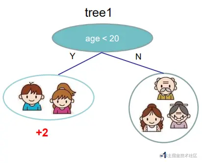 比如下图的树结点是基于特征(age)进行分裂的,设该特征值小于阈值(20)的样本划分为左子树,其他样本划分为右子树。