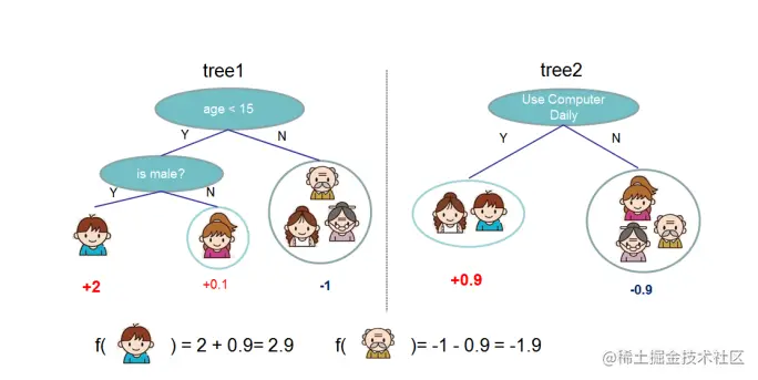 XGBOOST 类似GBDT串行学习方式,学习到如下图tree1、tree2,预测是将tree1、tree2结果相加。