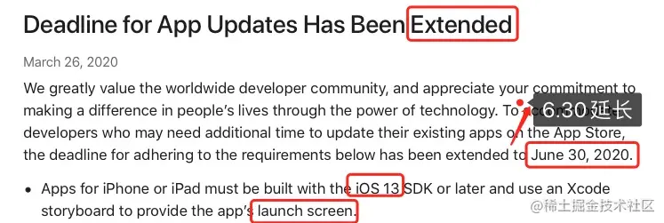 2019年WWDC会议上,苹果宣布提交审核的APP应用都必须要使用storyboard来配置启动图,原本规定是3月底结束,通过上面截图延长到6月底结束啦. 相关文档说明