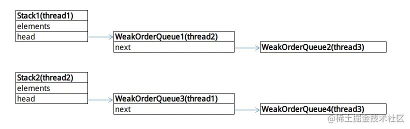 thread2要存放对象到Stack1中,只能存放在WeakOrderQueue1