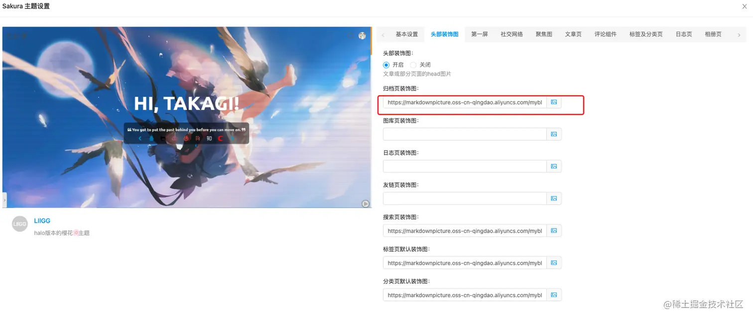 下面是头部装饰图,也就是每一个页面的图,比如点击归档之后的底图,这里我有好几个页面不设置。