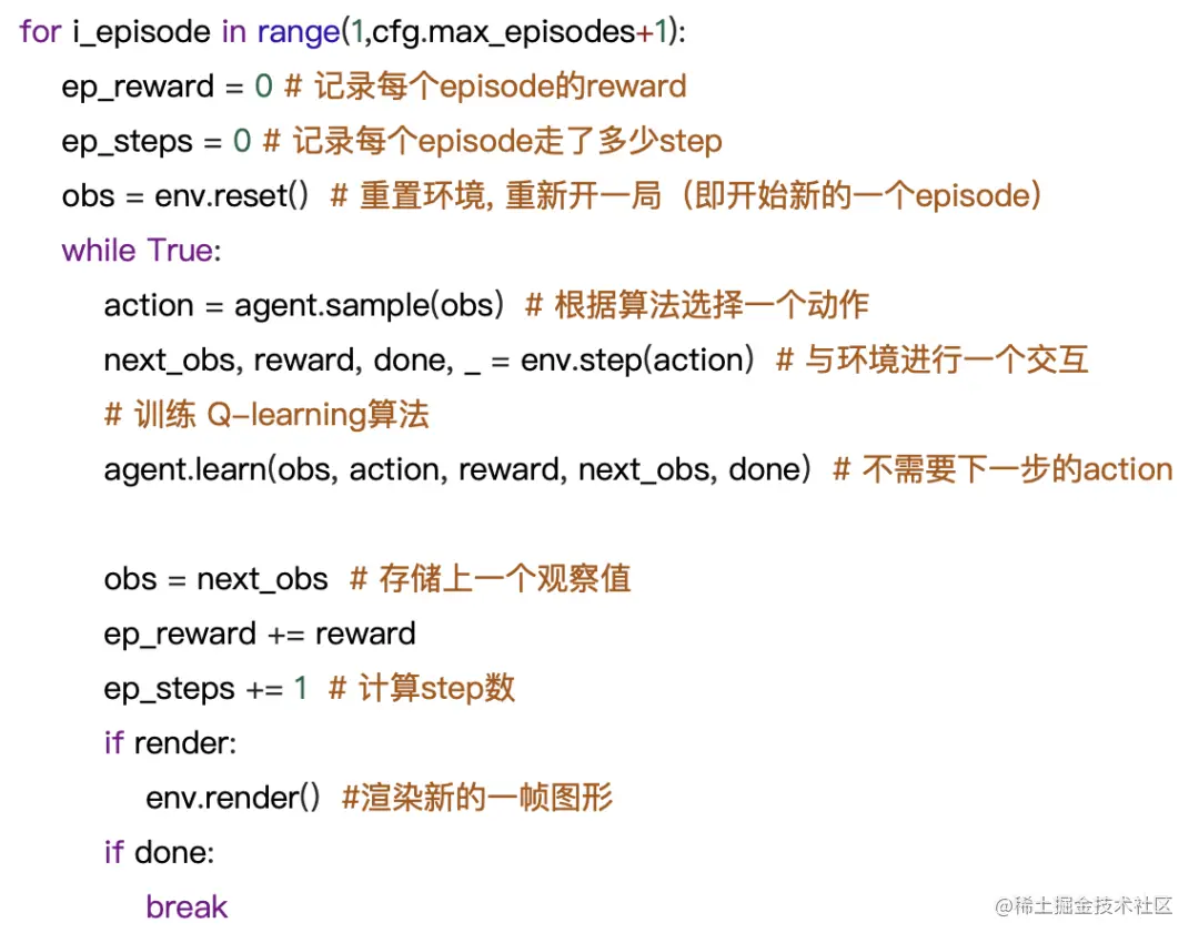 将整个强化学习过程分成以上几个子模块,方便拆解与改动,并且契合原论文的伪代码,在main.py中提供基本接口: