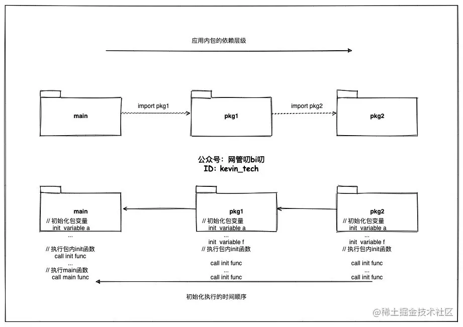 图的上半部分表示了main包导入了pkg1包,pkg1包又导入了pkg2包这样一个包之间的依赖关系。图的下半部分表示了,这个应用初始化工作的执行时间顺序是从被导入的最深层包开始进行初始化,层层递出最后到main包,每个包内部的初始化程序依然是先执行包变量初始化再进行init函数的执行。