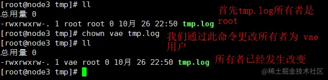 然后我们将tmp.log的所有者更改为 vae 用户:chown vae tmp.log