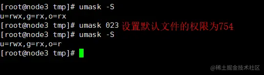 那么我们如何设置默认权限呢?比如我们想将新创建的文件权限设置为rwxr-xr--,也就是754。我们用777减去754得到023。也就是通过执行 umask 023 来完成默认权限设置。