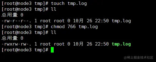 范例1:我们赋予 tmp 目录下的 tmp.log 所有者 x 的权限;赋予 所属组 w 权限,其他人 w 权限。