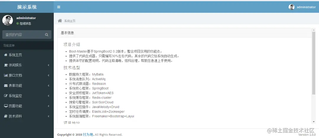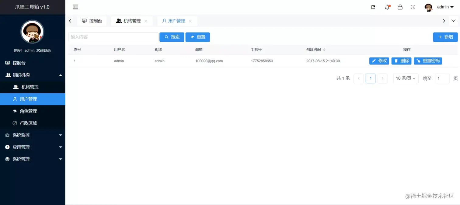 一个基于SpringBoot、JPA、Shiro的后台管理系统,单体架构,依赖少,极易上手,后端开发的福利。最重要的是还附带免费小程序以及微服务版本,可自行选择。