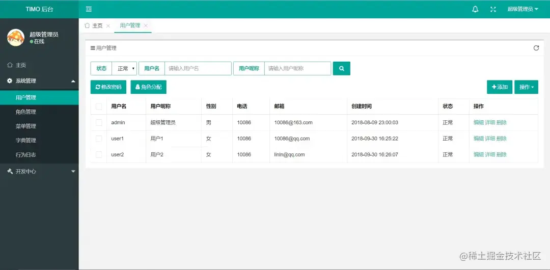 TIMO后台管理系统,基于SpringBoot2.0 + Spring Data Jpa + Thymeleaf + Shiro 开发的后台管理系统,采用分模块的方式便于开发和维护,支持前后台模块分别部署,目前支持的功能有:权限管理、部门管理、字典管理、日志记录、文件上传、代码生成等,为快速开发后台系统而生的脚手架