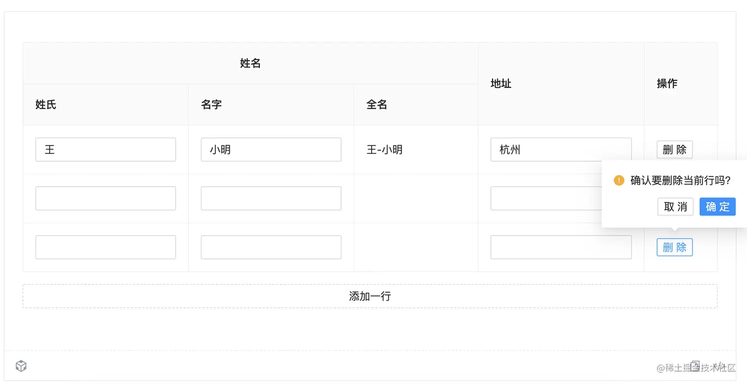 | handleAdd | 新增一行, 函数参数作为新增数据的默认值,当没有参数时使用defaultData作为默认值 | (v?: R) => void |
