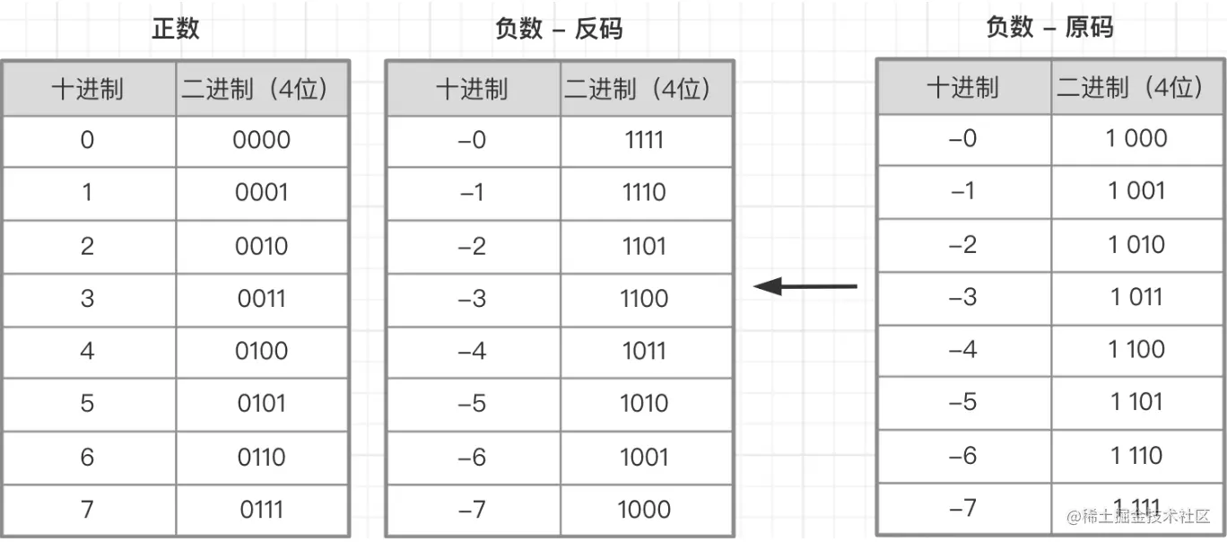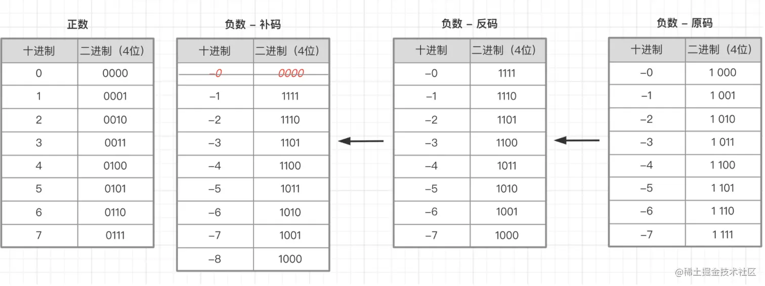 如上图所示,处理 反码 中的 -0 时,给 1111 再补上一个 1 之后,就变成了 10000,由于我们是 4 位存储,所以要丢掉除符号位的最左侧高位,也就是进位中的那一位,也就变成了 0000,刚好和左边正数的 0 相等