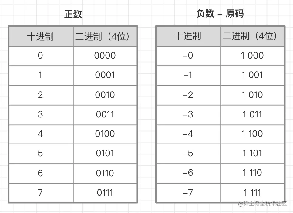 上图就是正负数的 原码,你可能在疑惑为什么上面表里我只画到了数字 7,上面也说了,我们这里使用的示例是 4 位(bit)的存储方式,只存 4 位,还有一位是符号位,十进制 7 的二进制表达方式就是 0111 了,数字 8 二进制算上符号为是 01000,这就 5 位了,就不是 4 位二进制能存下的了,所以,在只有 4 位存储二进制时,原码的取值范围只有 -7 ~ +7