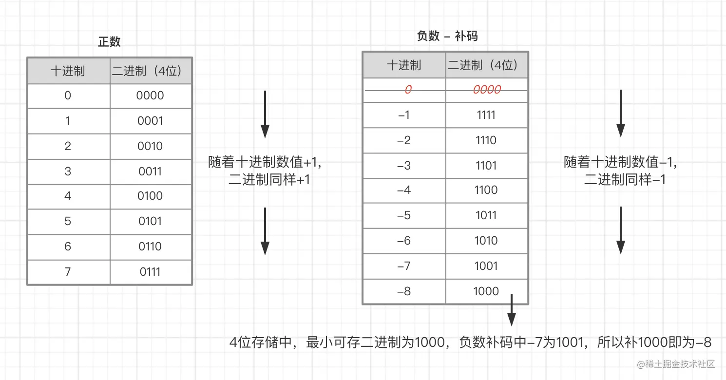 我们看补码表中由于 -0 的补码是 0000 等同于 +0,因为它补了 1嘛,我们发现 -0 就没有了意义,所以去掉了 -0 这个数字