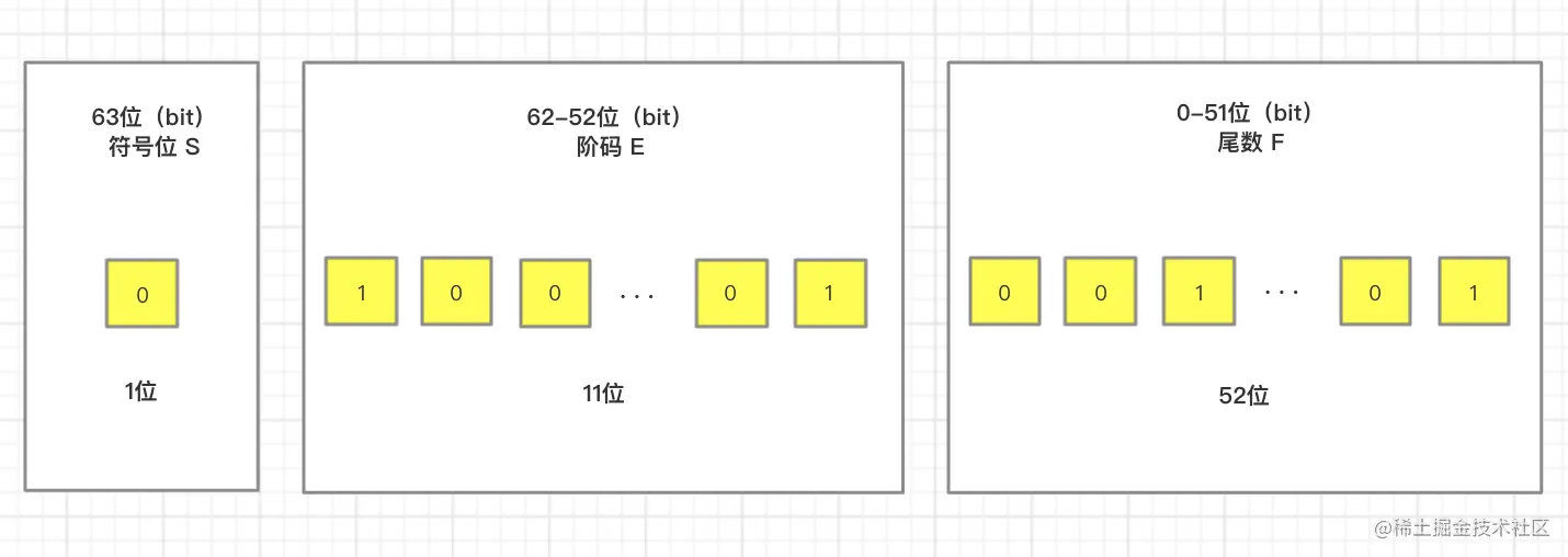 在 JavaScript 中,数字不分为整数和浮点型,也就是所有的数字都是使用浮点型类型来存储,它采用 IEEE 754 标准定义的 64 位浮点格式表示数字,如下图