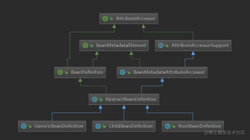 可以看到 BeanDefinition 接口的方法覆盖了 Spring 构造 Bean 需要的所有信息,是一个什么样的类型,构造器有哪些实参,属性的值注入哪些值,使用哪个 FactoryBean 来获取 Bean等。