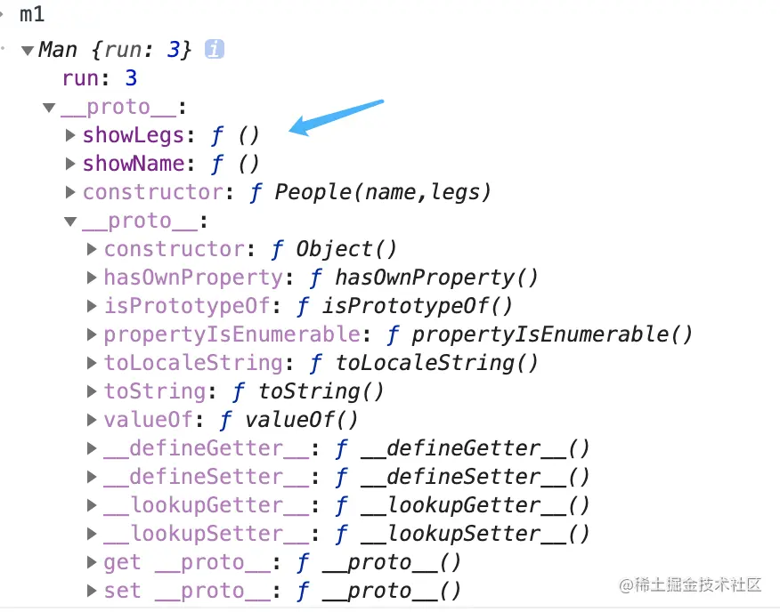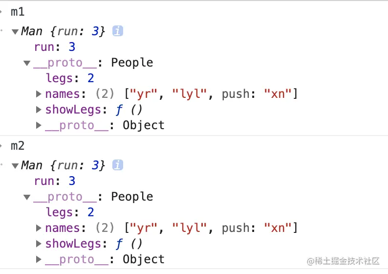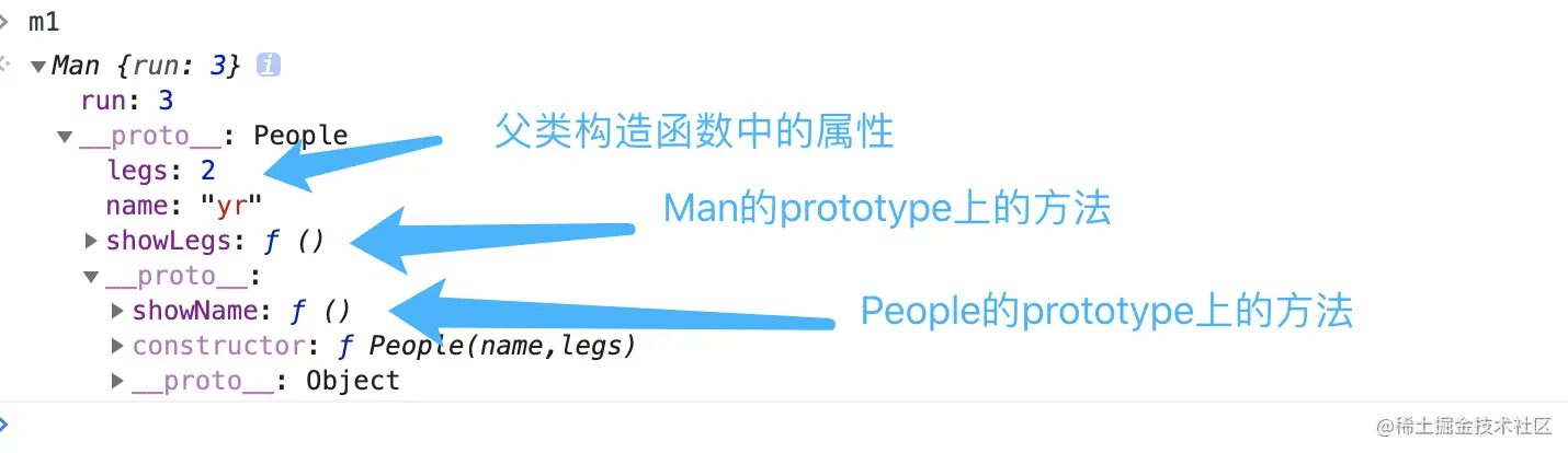 这种原型继承有个问题:就是直接将子类的prototype指向父类的prototype,这时他们两个使用的用一个内存地址,我们在子类Man的prototype上添加的showLegs也会添加在父类People的prototype上,显然这种方式是不合适的。