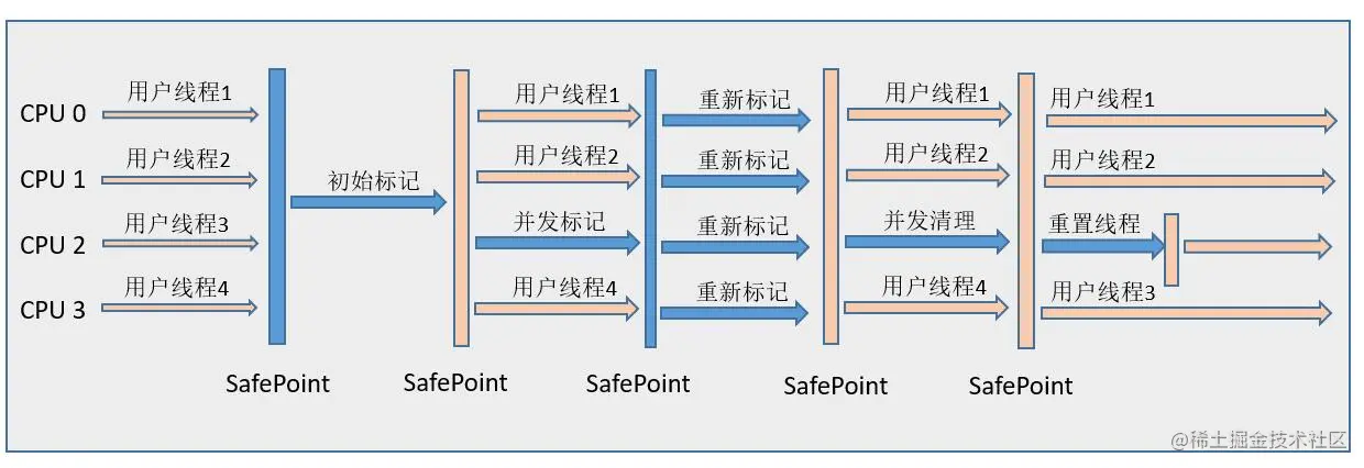 这些位置就叫作安全点(safepoint)。 用户程序执行时并非在代码指令流的任意位置都能够在停顿下来开始垃圾收集,而是必须是执行到安全点才能够暂停。