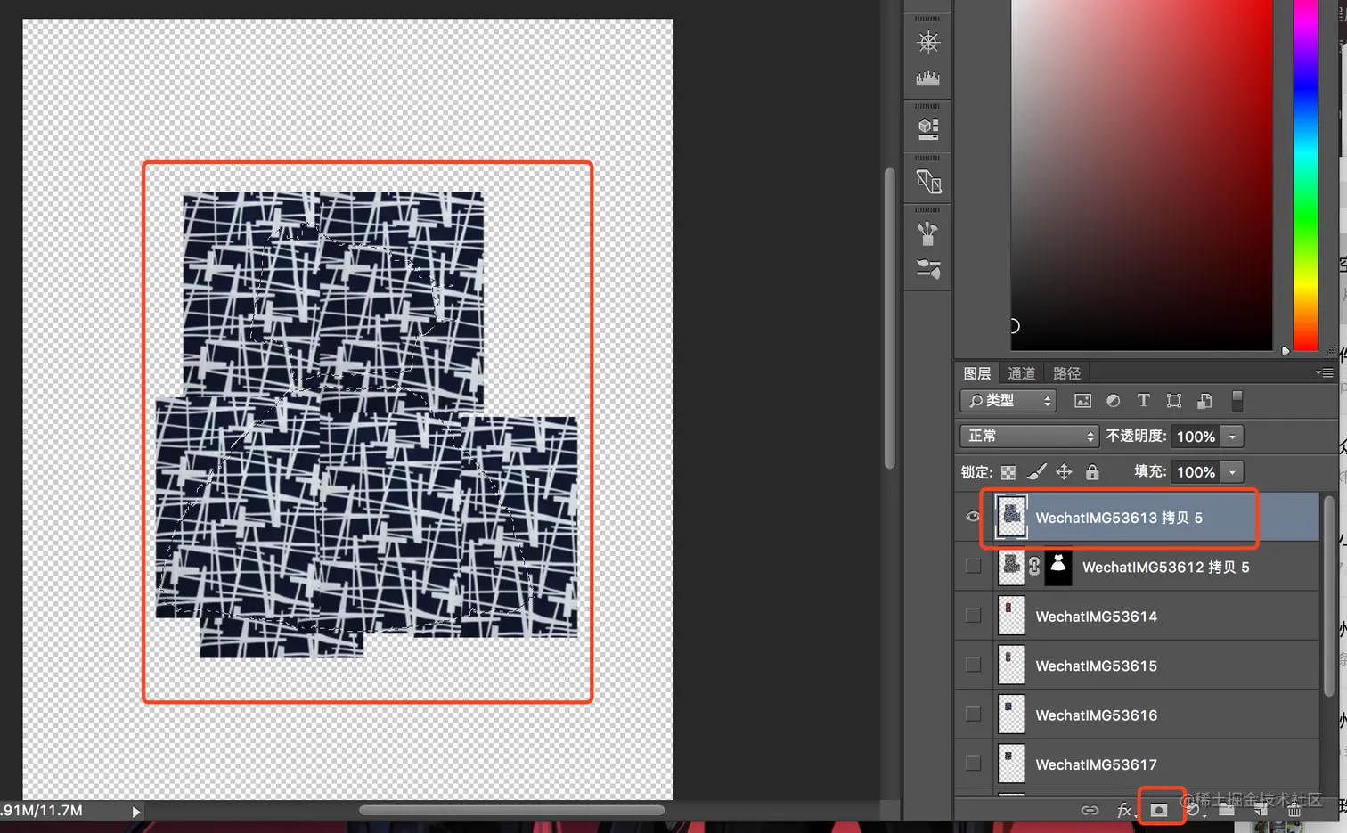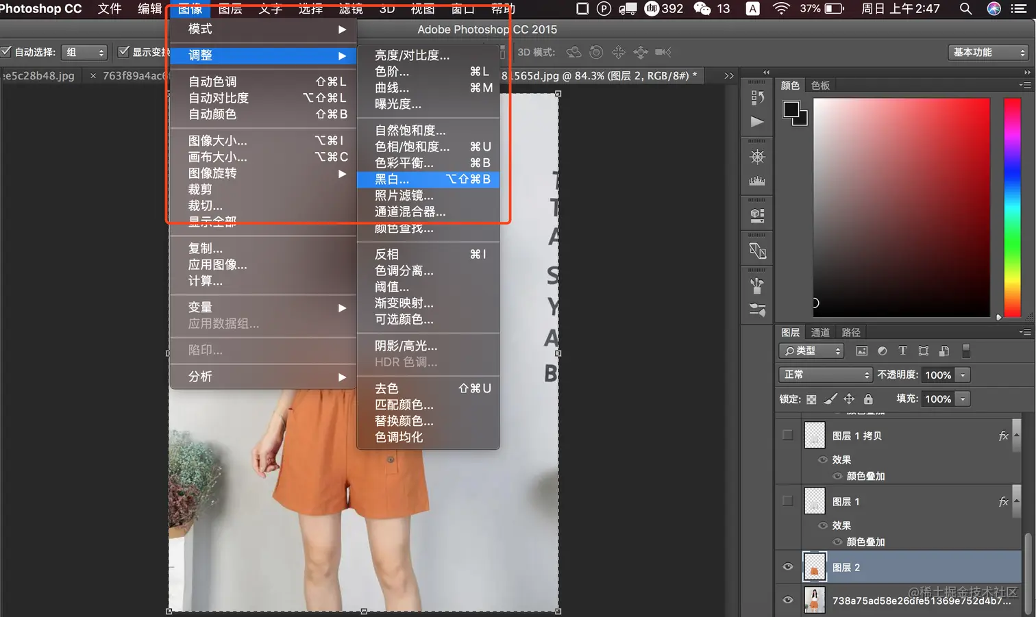 PS替换图片颜色以及替换图案 裘信宏 2020-11-22 965 阅读1分钟 颜色替换 快速选择工具选择需要替换颜色的选区 选择移动工具并ctrl+c ctrl+v 将选区内的图片复制出来 这时有一个单独的图层出现 对改图层进行黑白处理 预设选择最白后可以看到裤子脱色了 双击图层,选择颜色叠加,正片叠底后就可以颜色替换了 图案替换 快速选择出需要替换的区域 将需要替换图案置于选区中,然后点击蒙版 图案就替换好了