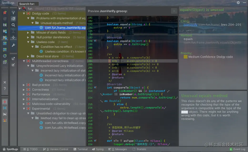 IntelliJ SpotBugs插件提供静态字节代码分析,以从IntelliJ IDEA中查找Java代码中的错误。SpotBugs是Java的缺陷检测工具,它使用静态分析来查找400多种错误模式,例如空指针取消引用,无限递归循环,对Java库的错误使用和死锁。SpotBugs可以识别大型应用程序中的数百个严重缺陷(通常每1000-2000行非注释源语句中大约有1个缺陷)。