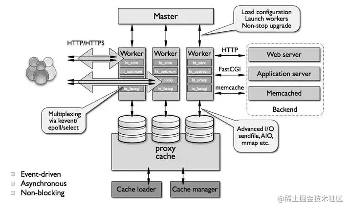 - 多进程: 一个 Master 进程、多个 Worker 进程。