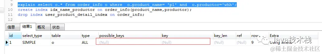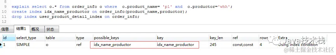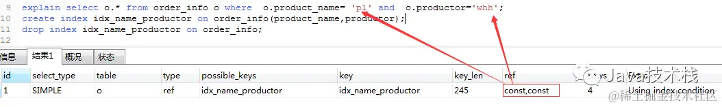 explain select o.* from order_info o where o.product_name= 'p1' and o.productor='whh';