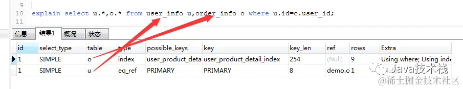 explain select u.*,o.* from user_info u,order_info o where u.id=o.user_id;