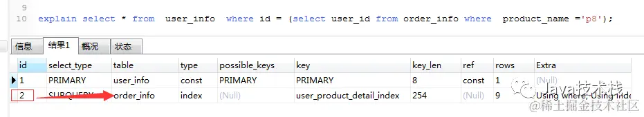 explain select * from user_info where id=(select user_id from order_info where product_name ='p8');