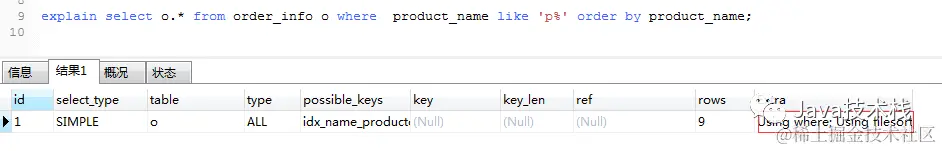 using filesort :表示 mysql 需额外的排序操作,不能通过索引顺序达到排序效果。一般有 using filesort都建议优化去掉,因为这样的查询 cpu 资源消耗大。