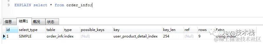 index: 表示全索引扫描(full index scan),和 ALL 类型类似,只不过 ALL 类型是全表扫描,而 index 类型则仅仅扫描所有的索引, 而不扫描数据。index 类型通常出现在:所要查询的数据直接在索引树中就可以获取到, 而不需要扫描数据。当是这种情况时,Extra 字段 会显示 Using index。