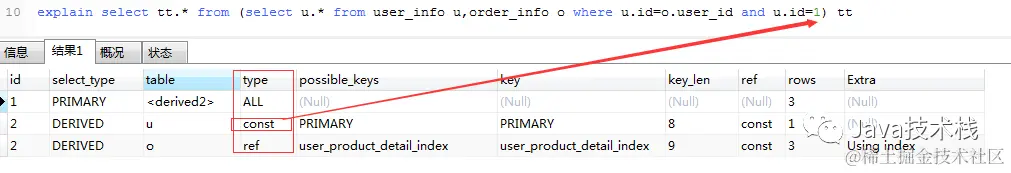 explain select tt.* from (select u.* from user_info u,order_info o where u.id=o.user_id and u.id=1) tt