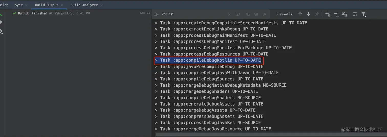 可以看到, kotlin 的 task 任务后面直接显示: UP-TO-DATE, 即跳过了编译, 直接使用缓存.