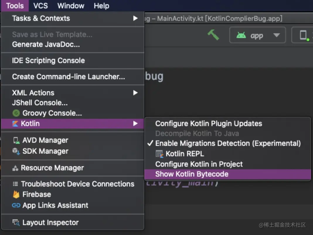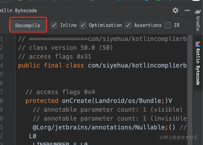 首先通过 IDE 直接反编译 kotlin ,得到编译后的 java 文件: