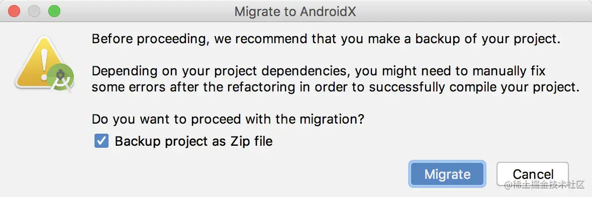 这里点击Migrate,Android Studio就会自动检查你项目中所有使用Android Support Library的地方,并将它们全部改成AndroidX中对应的库。另外Android Studio还会将你原来的项目备份成一个zip文件,这样即使迁移之后的代码出现了问题你还可以随时还原回之前的代码。