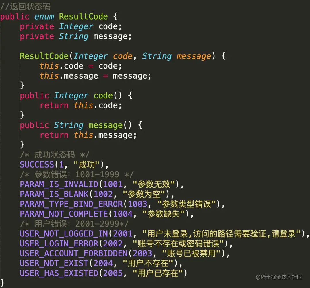 这样前端开发人员在得到返回值后,根据状态码就可以知道,大概什么错误,再根据message相关的信息描述,可以快速定位。