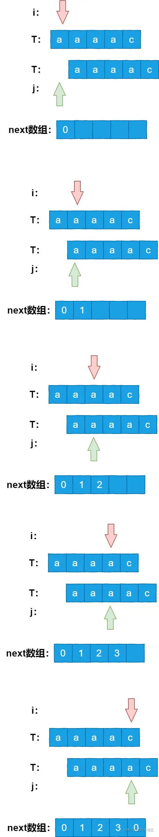 因此接下来就成了对部分匹配函数的是实现。将 “aaaac” 以首字符起始的所有子串的最大共有长度枚举出来,构成「部分匹配表」,它描述了失配时的下标 j 与部分匹配值的关系