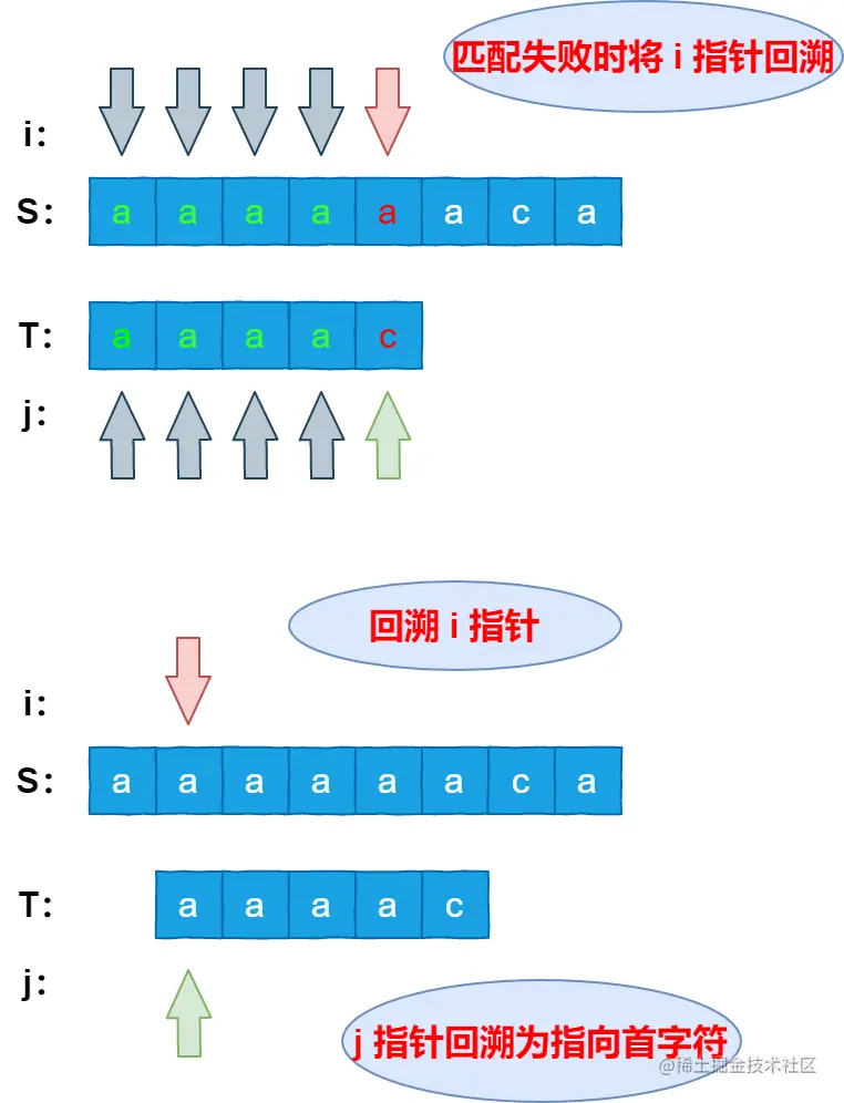 2、当出现「字符串不相同」时,也就是「失配」时,主串的比较位置重置为起始位置的下一个字符位置,模式串的比较位置重置为起始位置