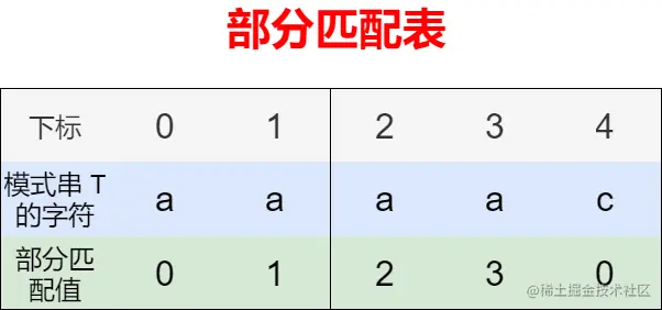 部分匹配表则是通过模式串 T 的自匹配实现: