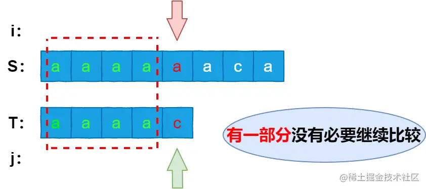 红线框出的部分恰好就是失配时已匹配部分,“aaaa” 的最大共有元素为 “aaa”,这一部分字符就是不需要再重复进行比较直接跳过的字符
