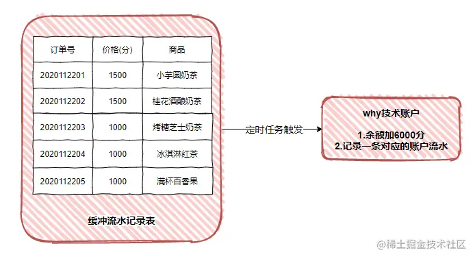 如果我们把缓冲流水记录表看作是一个队列。那么这个方案抽象出来就是队列加上定时任务。